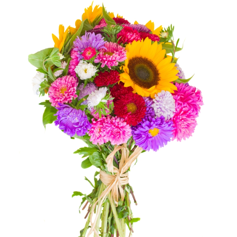 Букет состоит из 30 разноцветных астр, 3 подсолнуха, прозрачная упаковка, лента.